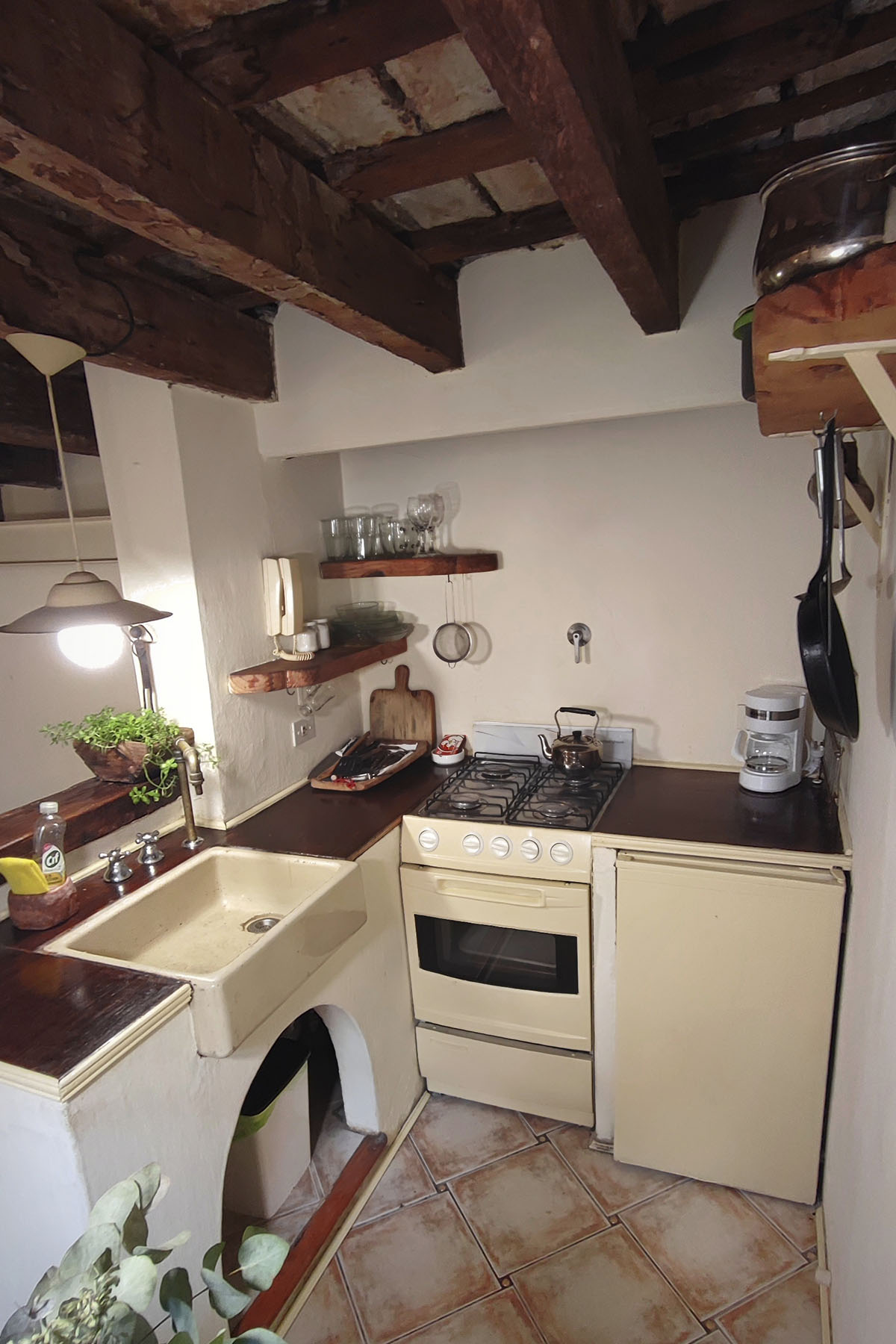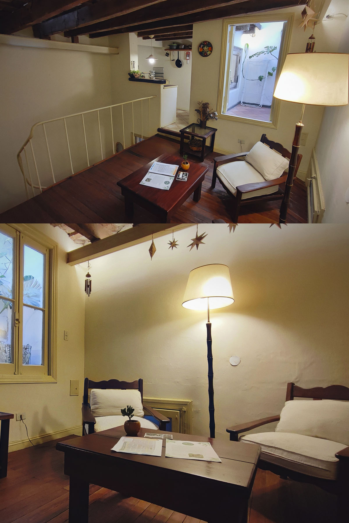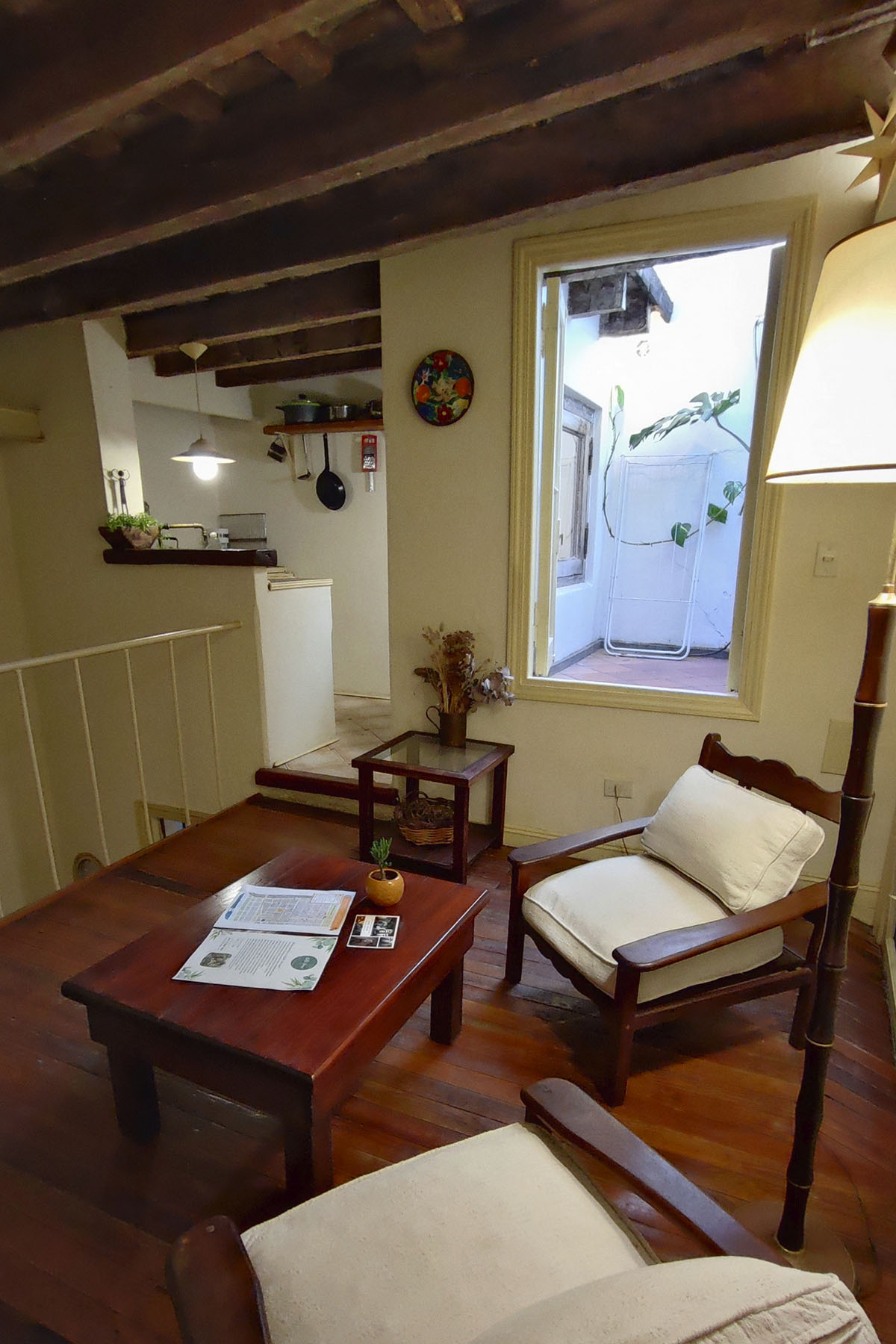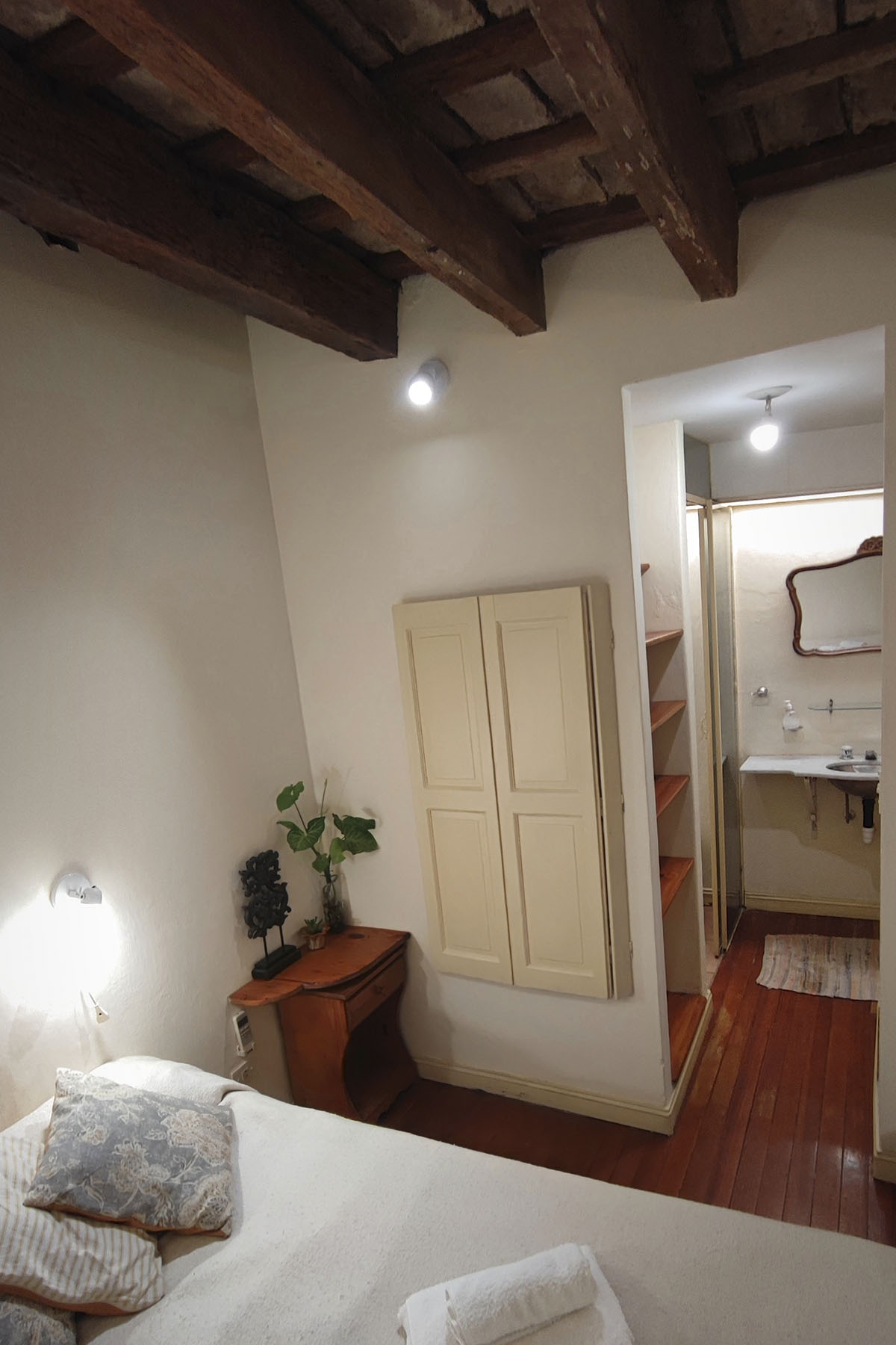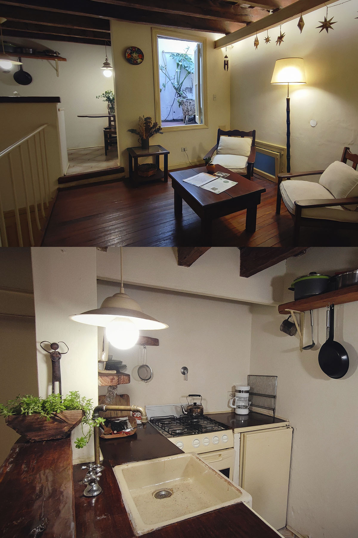 Departamento en dos niveles, cálido y silencioso, ubicado en el centro de la manzana. Pisos de madera, iluminación indirecta y un antiguo techo de ladrillos con tirantes originales crean una atmósfera acogedora. En pocos metros, el espacio está cuidadosamente resuelto para un uso cómodo y funcional.