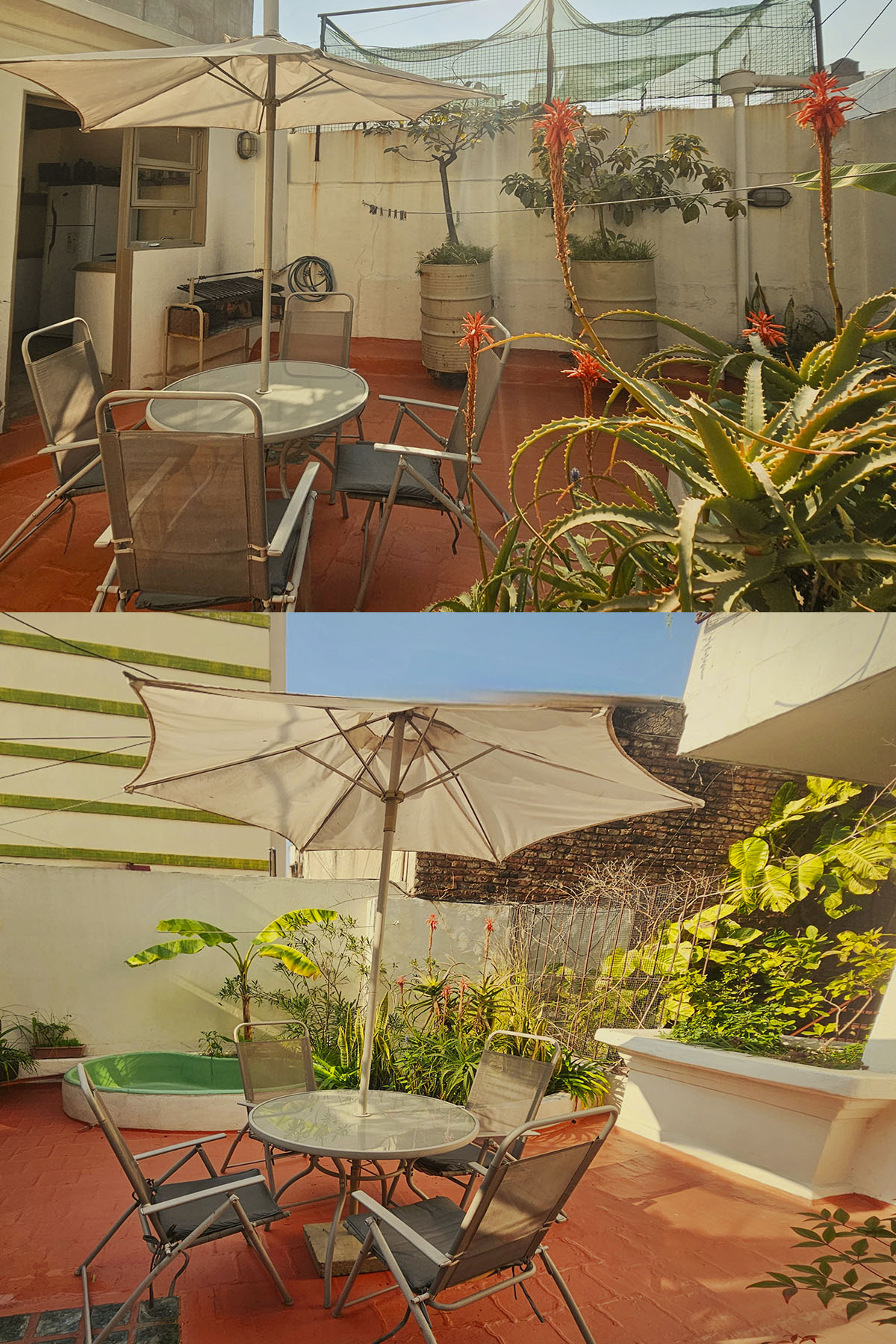 - Terraza privada de 25 m² con parrilla, mesa, sillas, sombrilla y pequeña pileta con agua fría/caliente.