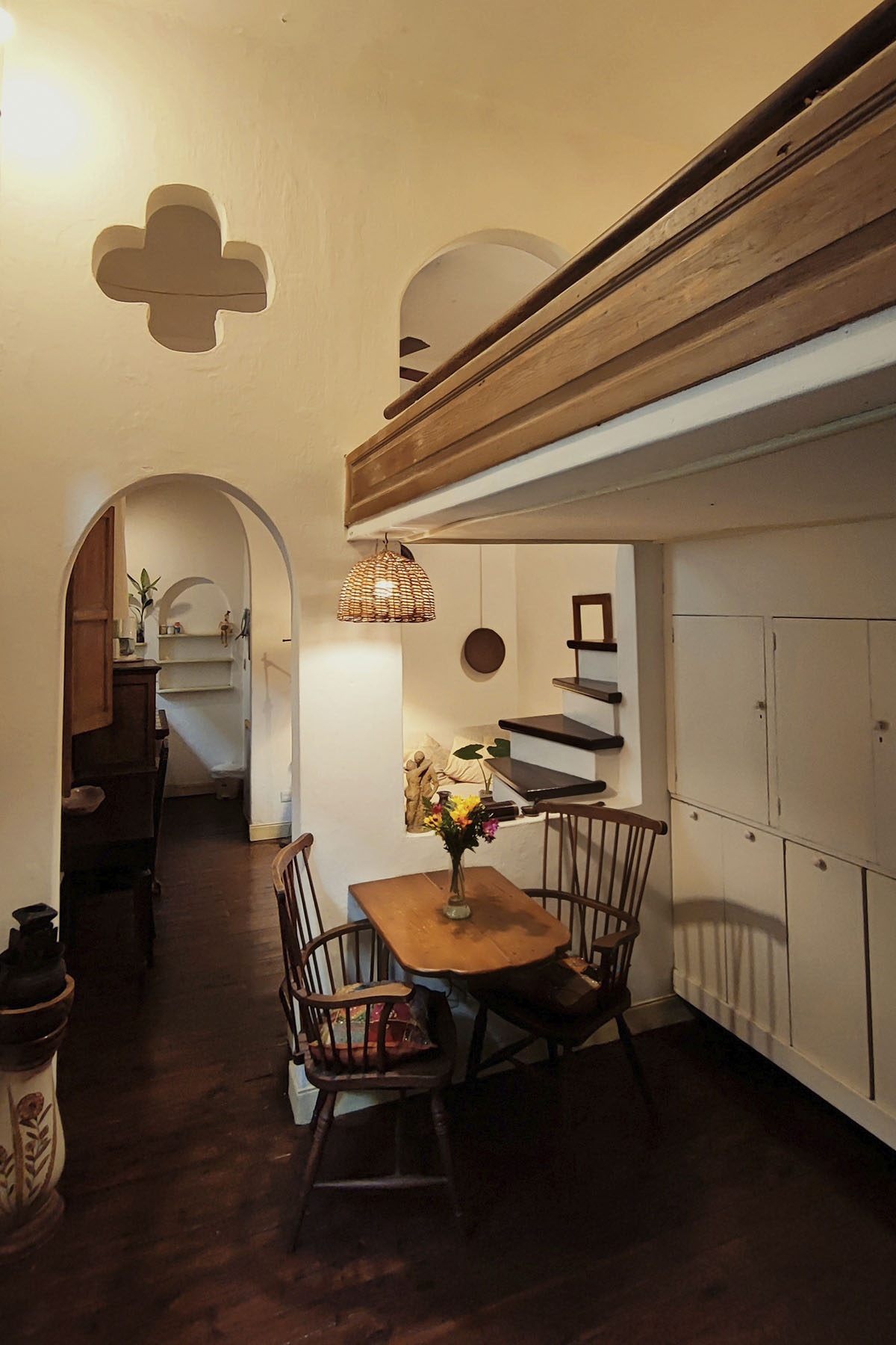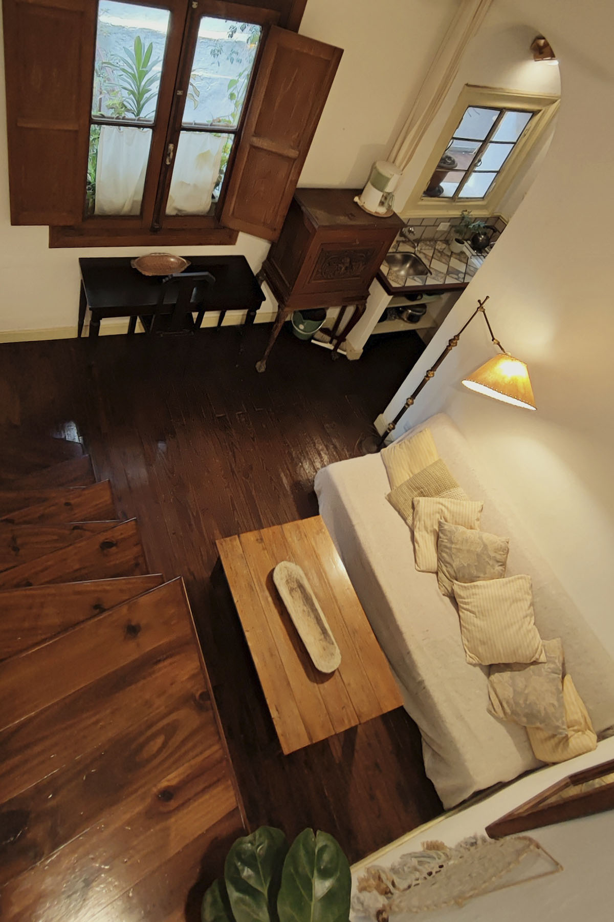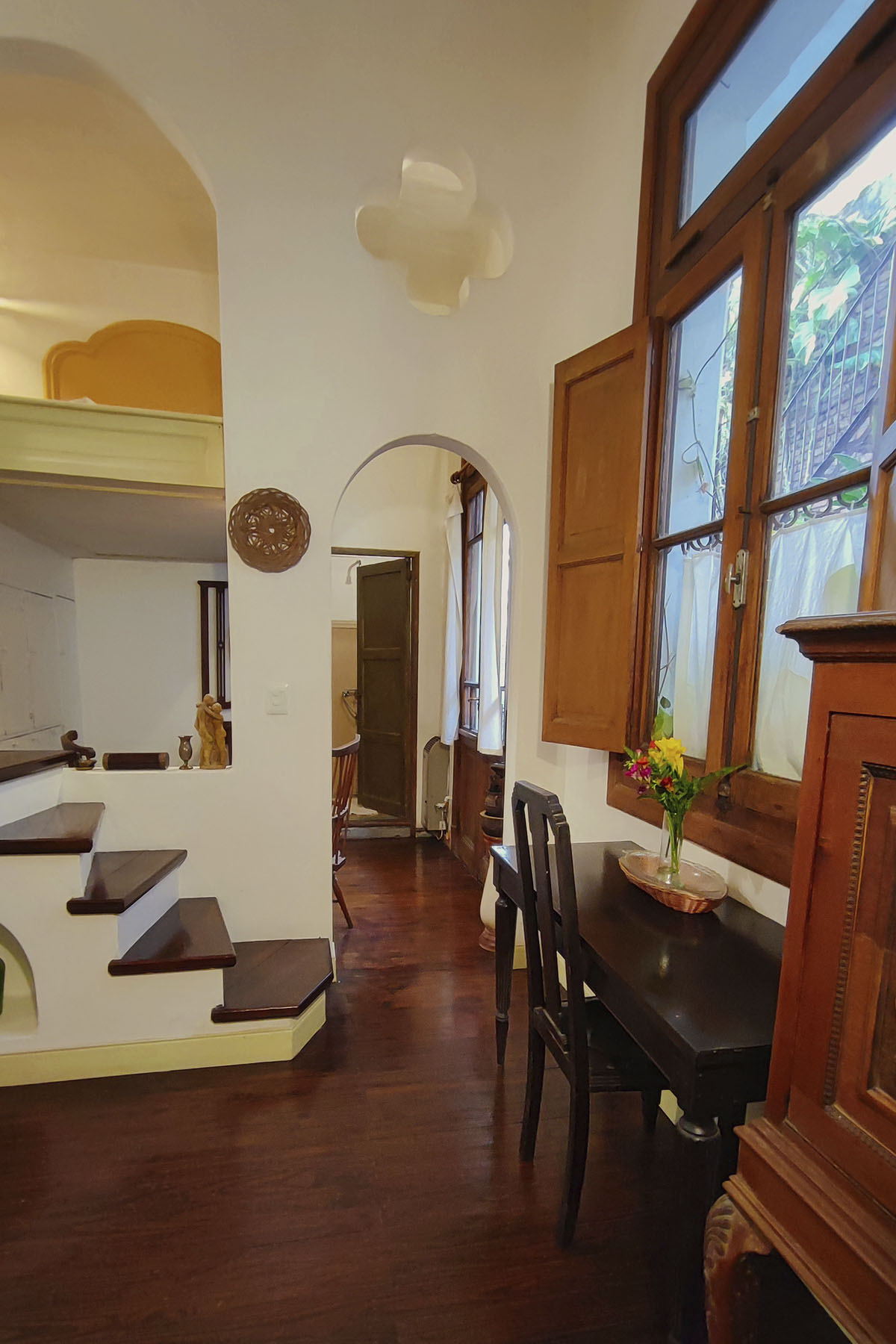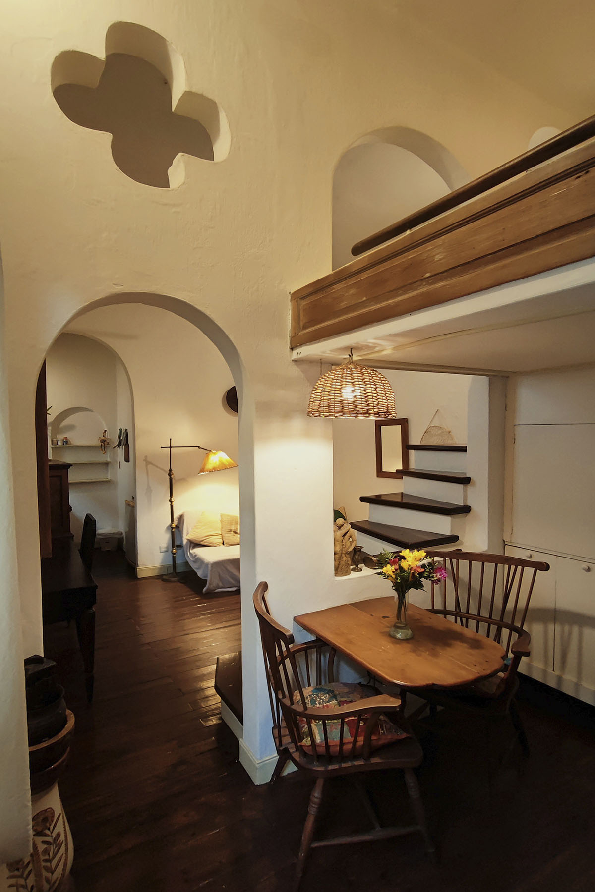 Departamento de diseño singular, con arcadas y espacios en desnivel. Escalera de madera hacia la cama doble y estar de techo alto que aporta amplitud y carácter.