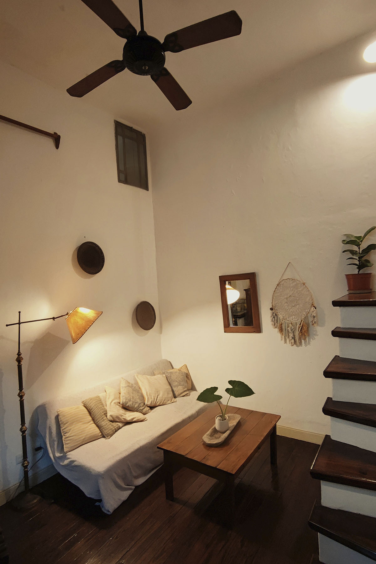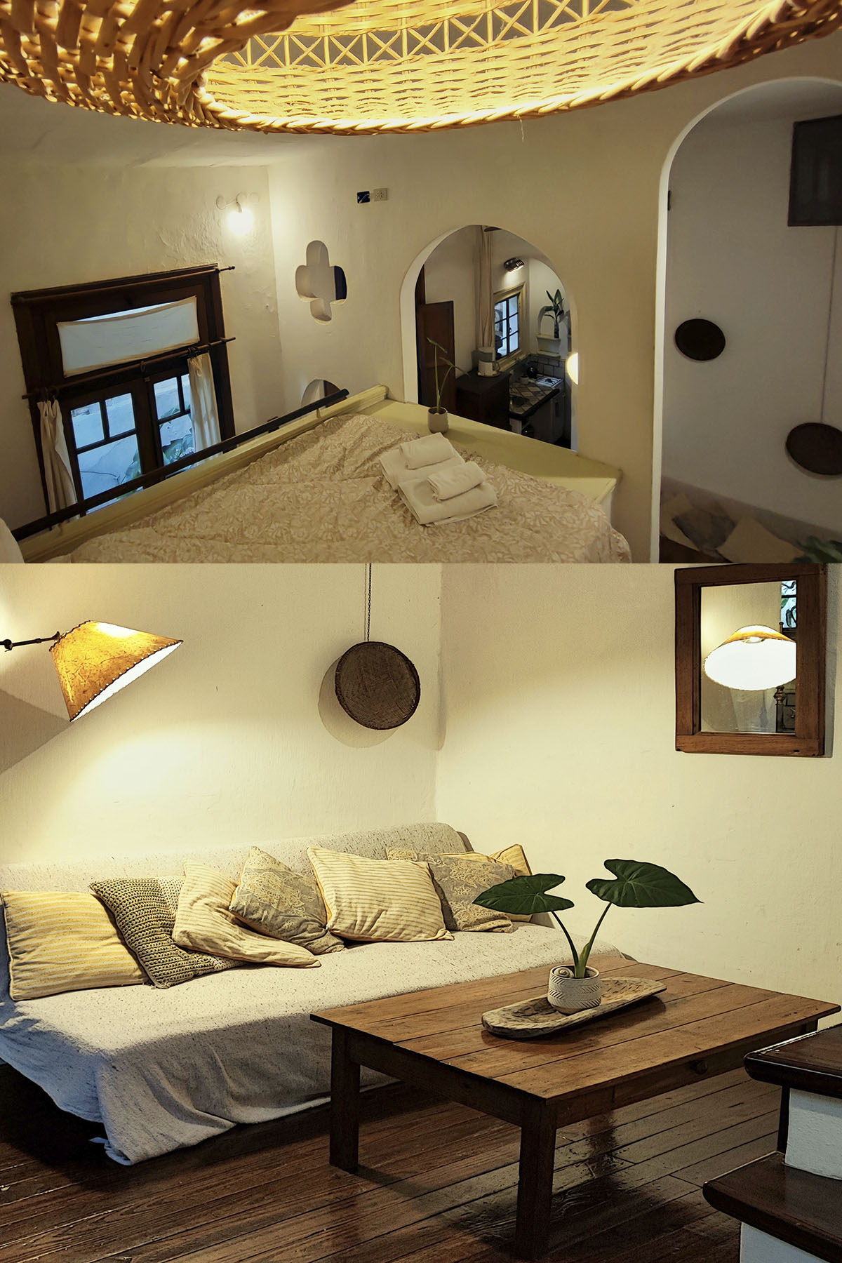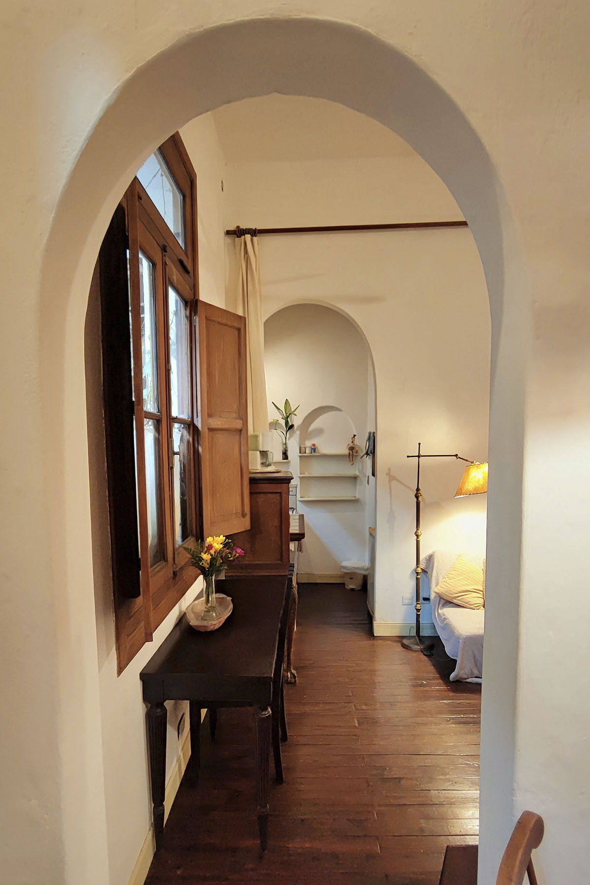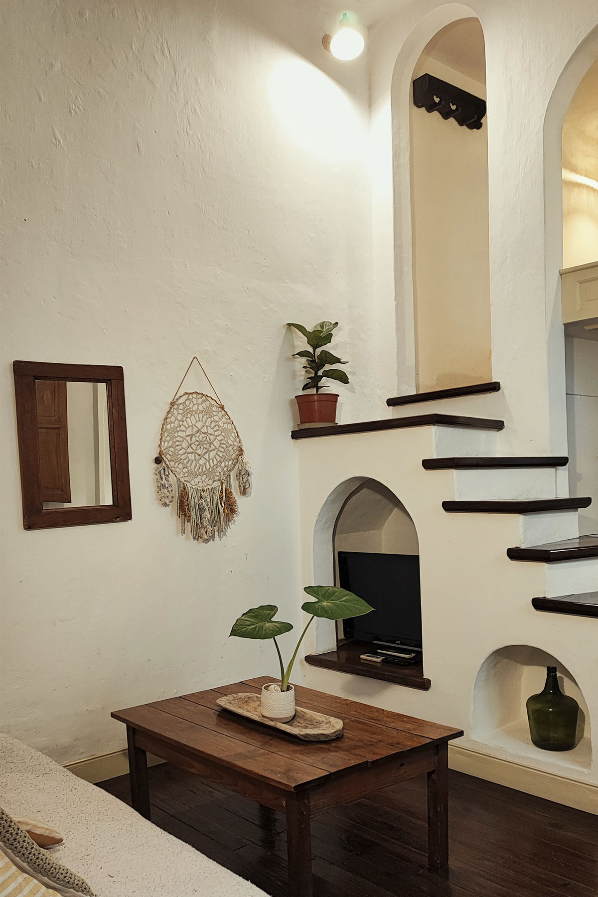 Departamento de diseño singular, con arcadas y espacios en desnivel. Escalera de madera hacia la cama doble y estar de techo alto que aporta amplitud y carácter.